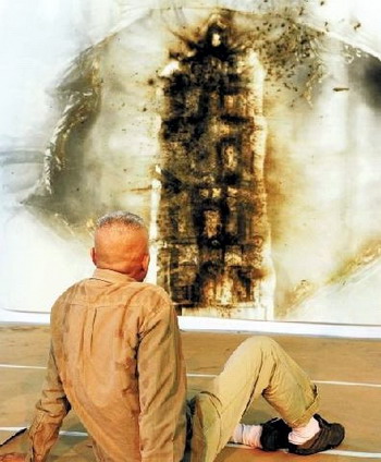 志愿者已经刻好一张“雷峰塔”,放到画纸上。蔡国强通过镂空的硬纸板,向画纸上撒上火药粉,当纸板被移开,一个雷峰塔的雏形已经形成。不过这还不够,蔡国强以手当笔,继续在那层火药上涂抹出雷峰塔的细节。