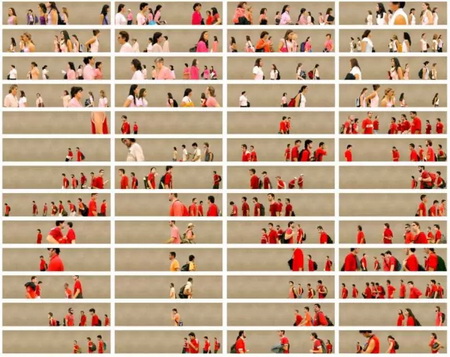 巴勃罗·祖莱特·扎热(智利):作者从20小时的连续影像中,以衣着颜色作为分类撷取静态影像的基准,把一个时间段中并非同一时间出现在同一地点的人群并置,以色彩和影像的韵律,用无数个体的切片来塑造一座时空纪念碑。(评委会评语)
