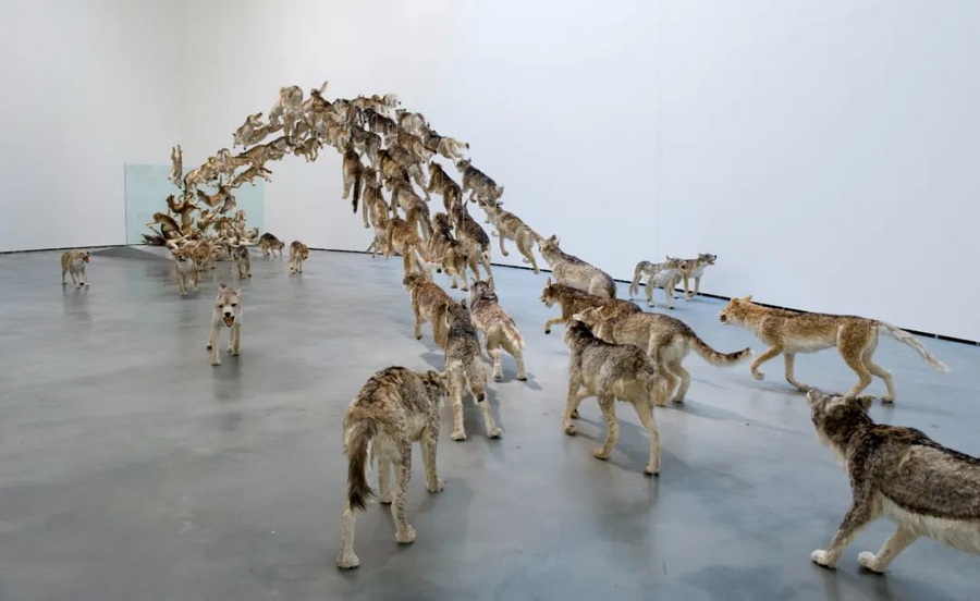 ▲蔡国强《狼撞墙》,99只狼复制品和玻璃墙,2006年 ©Guggenheim Museum Bilbao.