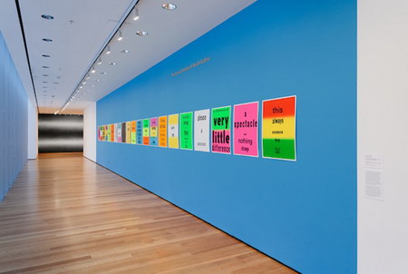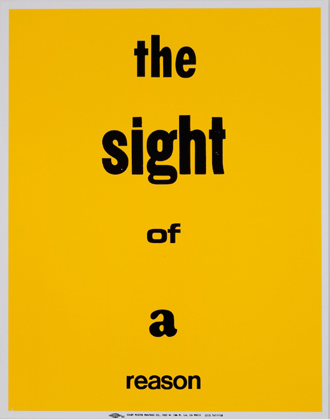 EP:我补充一下关于随机性,我认为她对于字母和颜色随机组合的欲望是因为,向David说的那样,Colby海报公司曾经作为廉价的广告手段遍布洛杉矶,因此他们成为了洛杉矶城市图景中鲜明的一部分。因此我认为,这种随意组合就像在改变一种词汇,像那种街头广告一样。她将海报铺满全城,不需要有同样的设计。海报上的文字来自于格特鲁德·斯泰因(Gertrude Stein)的《软纽扣》和《怎样写作》,尤其是《软纽扣》中“The sight of a reason”那章,我们将其改变,变成了我们展览的名字。