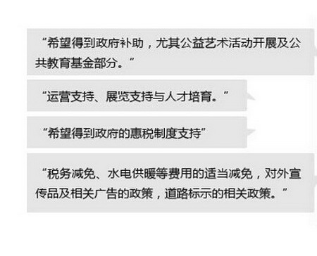 美术馆自身发展的每个环节都需要资金:从日常运营、人员雇佣、行政开支、硬件建设、媒体宣传、教育活动到项目支出。对于民营美术馆来说,每笔资金的来源都面临挑战。据调查,美术馆的场地租金半数在2万以下,但也有少数几家在5万以上。关于参观者比较在意的是否需要买门票这个问题,调查显示大部分民营美术馆都不收取门票。尽管基金会制度是民营美术馆赖以生存的重要方面,但是调查显示建立基金会制度的美术馆并不多。京沪民营美术馆每年用于收藏的基金大部分在100万以上,而用于学术研究的费用不等。对场馆设施建设投入费用每年50万以上居多。近半数享受到了国家的惠税政策,每年接受的赞助金额集中在150万以内。关于是否收取停车费方面,有三分之二的美术馆表示不收取停车费。