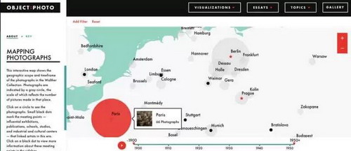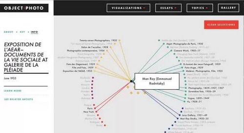 MoMA的“物件:照片”(Object:Photo)网络项目借助数据库的数据处理能力和交互设计的新颖形式感,给人们带来了认识摄影史、摄影家和作品的新方式。一位摄影师一生中曾见过的人,去过的地方,拍摄的作品都可以供人进行交叉比对。