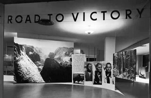 “通往胜利之路”(Roadto Victory)是1942年5月在MoMA开幕的,吸引了8万名观众,而后在美国和海外巡回展出。展览由爱德华·施泰琛(Edward Steichen)和卡尔·桑德伯格(Carl Sandburg)策划,赫伯特·拜亚(Herbert Bayer)从约5万张图片中选取了134张图片,以呈现一幅史诗性的国家肖像。据一位批评家说,这些图片被放大,布置的方式特殊,“在墙壁高处猛然凸出,冲击着你的视觉。”1955年,施泰琛和桑德伯格更进一步,在MoMA策划了又一场影响巨大的展览“人的家庭”(The Family of Man)。