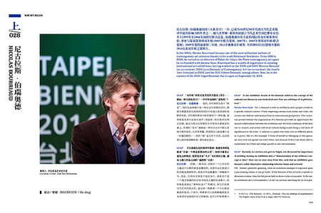 本期“里程”栏目中,采访了2014年台北双年展策展人、《关系美学》作者尼古拉斯·伯瑞奥德。海因茨-诺贝尔特·约克斯、苏伟、梁展峰、阿莱恩·斯奈尔思、尼尔斯·贝托里·迪尔在“会议室”栏目探讨了文化差异背景下的集体主观性及其美学;“未看完的录像”栏目介绍了刚获透纳奖提名的年轻艺术家詹姆斯·理查兹在北京魔金石空间的个展“以扰之名”;“素材”栏目将带领我们走进由瞿潇和刘风雅发起的独立艺术小组阿斯巴甜的独特艺术创作世界;“书架”栏目为我们推出两本理论著作《当代艺术范式:一场艺术革命的结构》和《我们从未现代过》;“声音”则由“声场与视域”国际声音艺术展引出了一段法国声音艺术小史;在“机构透视学”栏目为我们梳理了杭州清影当代艺术空间的成长历程;“展览制作”栏目由参观红砖美术馆的经历反思策展与艺术创作以及空间投资人、策展人、艺术家这三者的关系;“特别报道”栏目聚焦龙美术馆举办的陈逸飞个案研究展览。