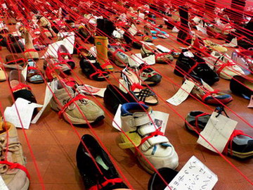 盐田:是的。这个作品先是99年在柏林,之后又在荷兰的华沙和克拉科夫先后发表。这已经是第四次了,不过像这样大的规模确是首次。这次通过美术馆的主页的途径,早在一年前便开始对公众征集,共寄来了2136双鞋子呢。