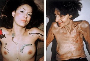 没有人愿意将自己丑陋、病痛的一面展现给别人观看,除了乞丐——当然现在又多了艺术家。汉娜·威尔克曾经给饱受癌症折磨并于1982年去世的母亲拍摄了几百张照片,当她发现自己也患有淋巴癌时,她决定将这具躯体的垂死过程变成艺术。年过半百,开始肥胖的她此时无复当年美貌,而严厉的化疗和服药,更使她逐渐脱光头发。她就让这具衰败的身体全裸出境。这套作品极具冲击力,不但有展现癌细胞每日吞噬她生命过程的照片,还有由脱落的头发、血迹斑斑的纱布和盛放药物的容器构成的装置,抽象水彩自画像,此外还包括她似乎从不曾停止创作的女性生殖器官雕塑。