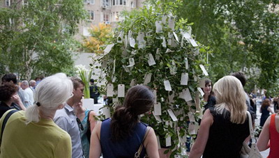 许愿时的感应会留在那儿。它不再只是某种进入你头脑又溜走的东西。你将它确定下来,而后你将这想法系在树上(作为一种展示),与他人的愿望在一起。这开始变得非常的强。而后它们被送到冰岛的“和平光塔(Imagine Peace tower)”(注:“和平光塔”是2007年为纪念约翰·列侬而建,那里已汇集了“愿望树”上的50万余份愿望)。