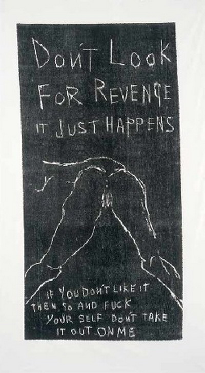 离开阿姆斯特丹市立博物馆,回到艾敏在Roslyn Oxley9举办的展览是具有启发意义的,并且一点都不缺乏复杂性。遗憾的是,观众在这儿看到的是她的最微不足道的作品。事实上,这些作品的微不足道使得她那些更雄心勃勃、更成功的作品反而显得渺小了。这个展览很夸张地被命名为《恐惧、战争和尖叫》(Fear War and the Scream),却只展示了一排“Eminobilia”——可以在当地市场上卖的废品。这个展览给人的感觉是,它是由从艾敏的B 或C文件夹中挖出来的零七八碎的玩意儿组成的,这些玩意儿都带有立即可以辨认出来的艺术家不断声称的痛苦的痕迹。这种痛苦的自我声言中最为极端的例子莫过于被扔掉的一些艺术家的拍立得照片,上面有艺术家无病呻吟的题字,“从新加坡到悉尼的路上我一直在哭”。对这种“告解”所有人的反应大概是“那又怎样呢”或者更宽容一点的“为什么”?当然没有任何解释,因为作品显示的足够使我们了解艺术家的痛苦,而无需问为什么;作品中也找不到任何自我分析的痕迹。这种自我怜惜的情绪充满了她的一批容易被忘记的单色版画,上面写着这样一些话:“可怜的小东西”,“我一定有什么地方问题巨大”,更幽默的可能是,“有各种不同的感觉被操的方式”。这些版画作品不时地混合着了蒙克式的对情欲的恐惧和暴力的、军国主义统治的隐喻。作为一个长久以来的遭受苦难者,艾敏与其他受难者——例如受到导弹轰炸的受难者——的状态感同身受。在它们有穿透力的潜力中,艺术家使之接近机械的阳物,显得坚硬、有侵略性、暴力,很难说这个有创造力的隐喻,也不能说是一个微妙的暗喻。更糟糕的是这件作品中仿制的信息的类型,依然是一成不变的空洞和平庸——类似“战争是糟糕的” 这种简单陈述的各种变体而已。这种极其头脑简单的陈述等于什么也没有说;没有任何意义或情感因素,缺乏起码的分析理解的成分。事实上,如果把情境换成“战争是好的”都要更有效一些,因为这是个极难证明其正当性的情境,除非使用最怪诞、令人生厌的道歉性语言,才能使得这个荒谬的陈述显得有点儿道理。正好相反,艺术家的抗议在这里好比最为古旧而傲慢的的自由主义/人道主义陈词滥调。当然,自由主义/人道主义是建筑在全球资本主义的根基之上的,如柏林达达主义者们很早以前就提出过的,商业主义与战争是一丘之貉。因此,抗议的姿态在艾敏的展览不是别的,而是对人们在艺术家——特别是那些以其自我标榜的“感觉”能力而知名的艺术家——那里所期待的东西的模拟。总的来说,《恐惧、战中和尖叫》散发着犬儒性的机会主义臭气。