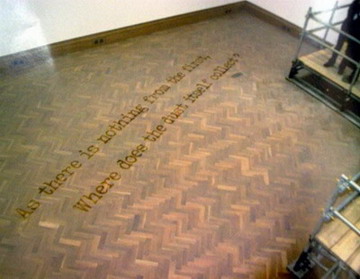另一个代表性的例子是,2004年,徐冰在英国创作的装置——《尘埃》引起了国际艺术界的普遍关注。表面看,作品在制作上十分简单,就是艺术家将从世贸大厦废墟中收集的尘土洒在展厅里,然后在上边用英文写上“本来无一物,何处惹尘埃”的诗句。这件作品仍是一种挪用,只不过挪用的是文本资源,而不是艺术史上的图式。六祖惠能的禅诗是这件作品的前文本,共同与在“9·11”尘埃上写的诗句形成一个意义链,构成一个新文本。但在对原文本解构的过程中,新文本却在“9·11”恐怖事件的国际社会语境下产生了新的文化意义。也就是说,徐冰非常智慧地通过“尘埃”表达了自己对西方围绕“9·11”所引发的国际文化冲突、恐怖政治、东方威胁论等问题的思考。不难发现,判断挪用的有效性的依据之一,就在于作品因文本语境发生变化后,是否能呈现出一种新的意义,以及这种意义能否触及到当下的社会、文化,包括艺术本体等方面的问题。