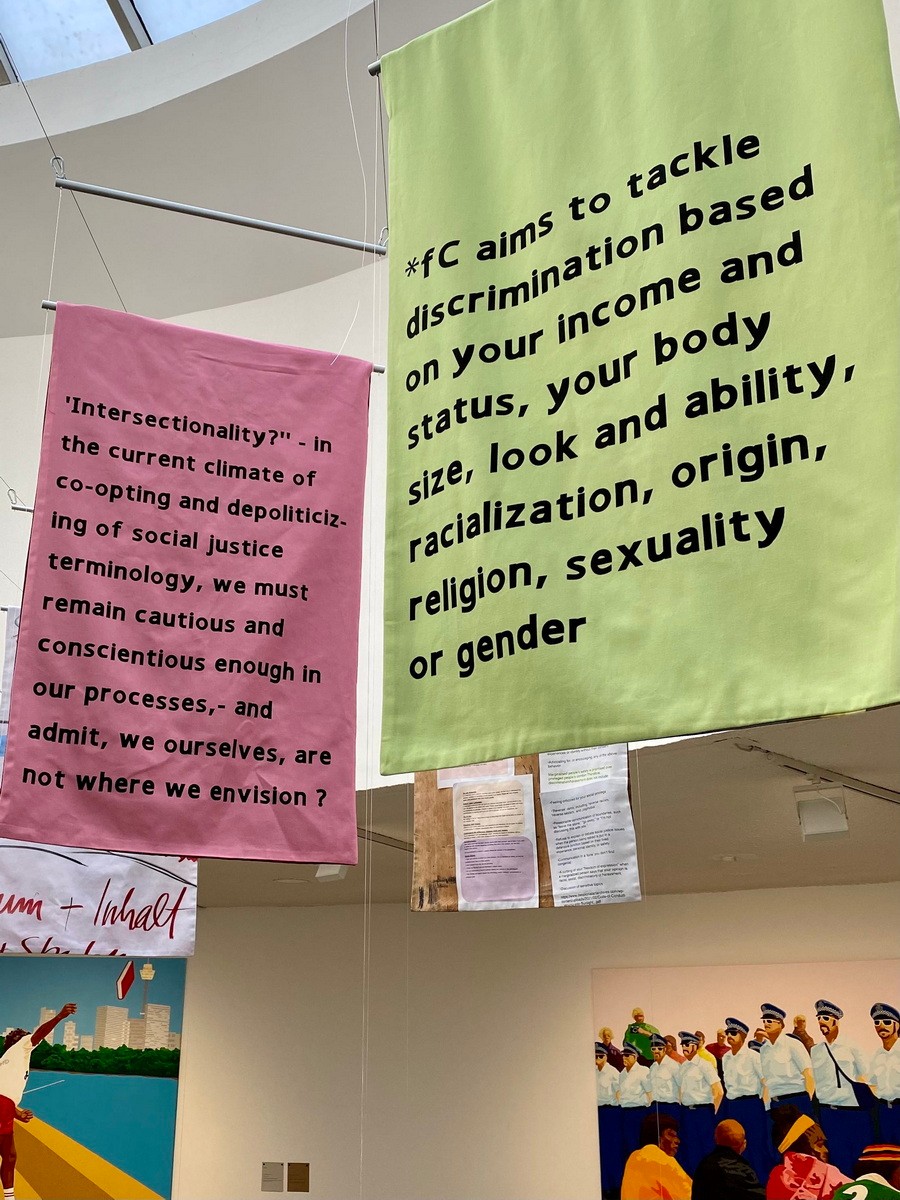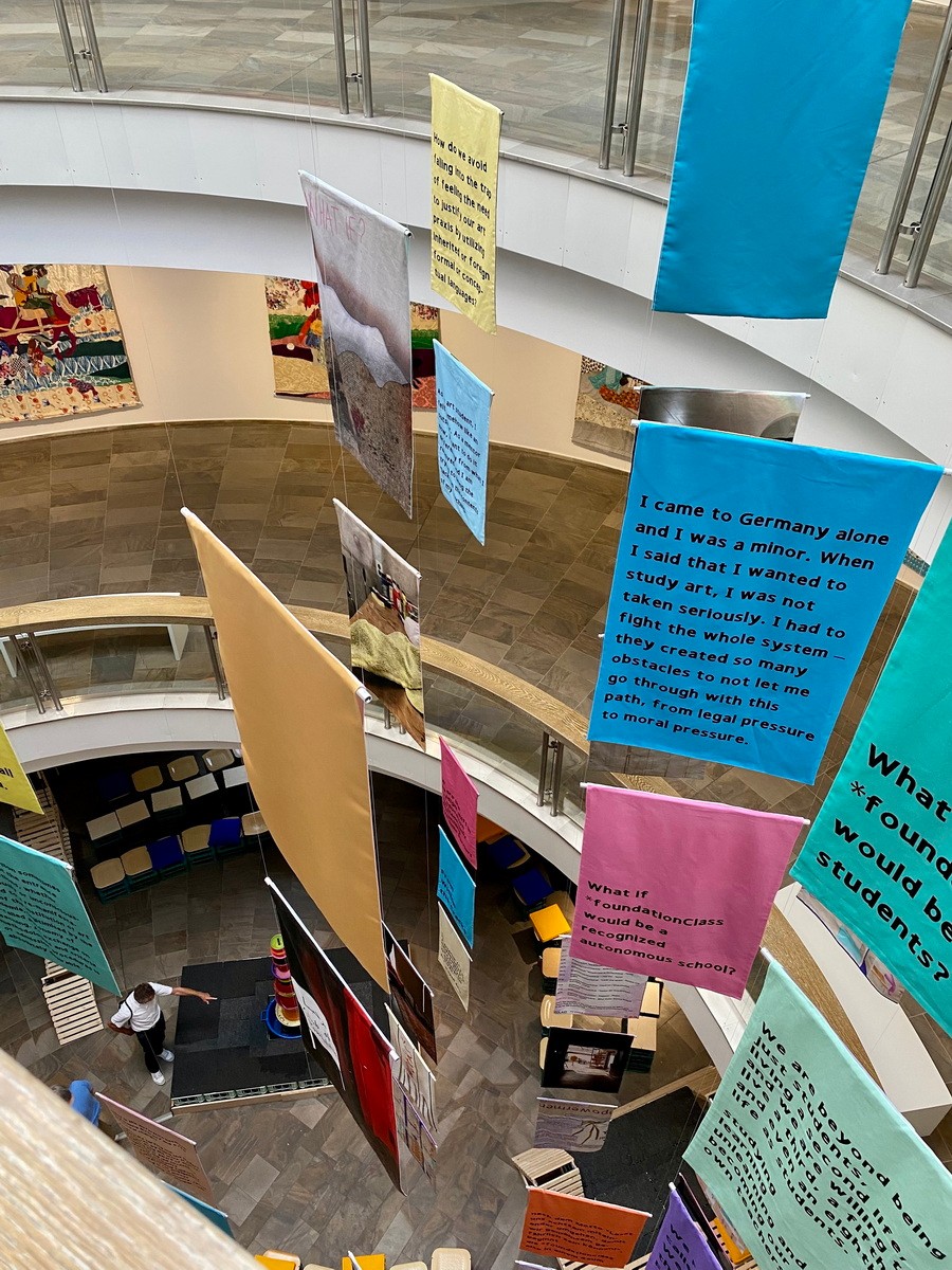 在Fridskul的中庭,悬挂了来自Foundationclass的标语横幅。Foundationclass成立于2016年,柏林白湖艺术学院,作为一个艺术教育平台,帮助移民德国且可能遭受种族歧视的少数族裔进入艺术学校。同时致力于反对艺术圈的孤立机制。