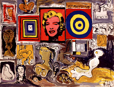 如果说华继明在92年直接选择、搬用《世界美术——梦露》《美术——毛》杂志进行绘画描绘的作品,转换成波普的生存感受,那也是一个比较早的波普文献,符 合当时的文化情境,而93年为纪念自己从事绘画16年,翻看《世界美术史》时,对世界美术作品在画布上自动涂鸦,带有很强的青年冲动与感性化,对世界艺术 绘画作品体验、憧憬。与以前92、93年作品比较,2005年的作品开始进入一种理性思考,也给自己提出很多难题:选择什么作品复制,复制后转换成什么样 的生存感觉?复制会不会引发版权问题?这些作品有没有原创性?是直接拿来、自动转换还是对作品进行修改、恶搞?这样的作品有没有意义?这一系列问题都触及 到了艺术的本质问题。