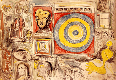 一.构成及图式统一而有变化:堆积、收集、框架式、有束有破、有大有小、个性与共性统一,每个形象的并置也产生一种异样的关系,同时具有一种“捆绑”的力量。