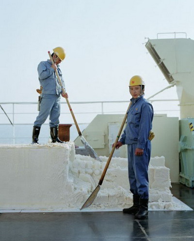 巴尼一旦用图形表示出这个有三部分组成的结构,他又有了新的兴趣:他想缩短系统的循环,直接跳过“产出”这个阶段。于是体内的(系统)矩形方阵就会只在 “情景”和“控制”这两个层次之间、以及欲望和节制之间摇摆,处于一种永无休止、自我指涉、自行煽情的循环。这位艺术家说:“若是没有了‘产出’阶段……大脑就会直接通到屁眼。”’’形体则会进入一个“尾螺旋”(8)。与他早期的大部分作品一样,雕塑《单元食物团》(unitbolus)(1991)把生物药学术语和冷藏间的饰物融合到一起,恰好表达了他这方面的创作观点。作为一个生理学术语,“bolus'’指的是咽下的或经过消化的食物。在这里它成了一个标题,作品是一个冷冻工具架上放着凡士林哑铃。艺术家把这个天然具有可塑性的双头物体形容为“一扇门,可以通过肛门直接插入。”这一行为从本质上“完成了循环”,并使身体抄干一种密闭而又自给自足的状态,”(9)在《原野装点》(FieldDressing)(1989)这部表演录像作品中,巴尼效仿了这种状态:他用凡士林填满身体上的所有孔洞:耳朵、鼻子、嘴、肛门、阴茎。这种费力的重复性劳动要求他得一丝不挂,只用一个系带把自己吊在天花板上,然后从地板上的一个盆里舀出液体注人身体的孔洞中。