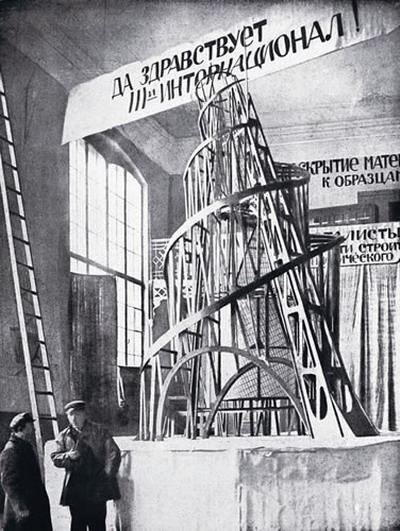 弗拉基米尔·塔特林与助手在布尔什维克第三国际模型前。