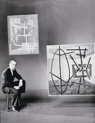 1954年抽象表现主义艺术家恩斯特在他的作品前。