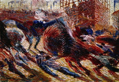 图为未来主义艺术家波丘尼作品,他对于工业生产是极力提倡的,他认为“现代生活的漩涡—一种钢铁的、狂热的、骄傲的、疾驰的生活”。