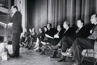 图为格林伯格在演讲。1960年代那种对于资产阶级和庸俗文化的深刻而豪迈的批判在格林伯格笔下已经荡然无存。