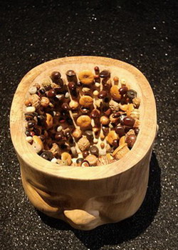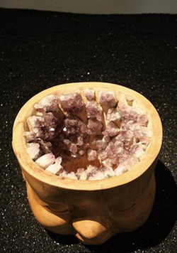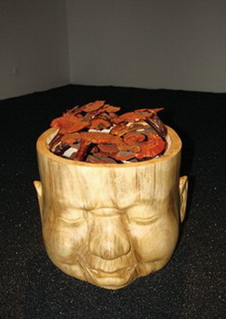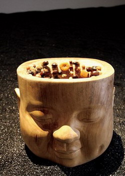 从自然环境中提取出的这三种形态中,每个形态中的具体材料都有其本质寓意。例如:水晶的结晶体结构:具有构成物质复杂几何体基本形态,折射出物质的原初构造。古老的吉普赛人用观察水晶球占卜过去、预知未来,称之为“灵媒” 。灵芝在道教的“炼丹术” 中秘制的长生不老的药方中占有重要的位置。在中医药学中也是不可或缺的一味灵丹妙药。“菩提”从其字面解读具有佛教意昧,佛祖释迦牟尼开悟就坐在菩提树下,所以菩提子象征着佛教顿悟的境界,在现时的中国对佛教感兴趣的善男信女都在手腕上带着由菩提子串成的佛珠,以示信仰取向。“陨石”含有宇宙各种矿物元素的结晶体:陨石的种类分为不同:我拥有的 是铁陨石、玻璃陨石、石陨石。这些陨石中潜藏着调解人体频率的放射性元素,对分泌系统、消化系统、神经系统都具有良性的调解功能。“史前石器” 的信息传达给每个人是:远古祖先使用过的石制工具,是人类有别于任何物种的有力证据,证明人是智慧生命。最后,我要说的是松树结的果子:“松果”!有科学家证明:有个形似松果体的器官置于人脑的后半部分是一个毫无用处的废器官。而有些古老民族宗教中则认为“松果体”的存在是人体修行最重要的部分,人体的中枢神经系统全部汇聚于此,做爱时的高潮、冥想时的入定、灵视中的观想,意念移动、远距离遥控等等特异功能的实现,都是这个“松果体”在起作用。另外:“娃娃脸”形象是借用中国传统民间道教驱鬼避邪的教义“孩子是纯阳之物” ,具有强大的生命能量。是呈载具有特殊能量物质的仪轨道场。