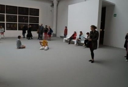 在绿园城堡中心馆中心位置的空地上,一组看似表演行为艺术的人士成不规则组合或趟或坐,以轻松愉悦的声调即兴吟诵着提诺作品的名称——《这(作品)如此当代,当代,当代》(This is so contemporary, contemporary, contemporary),他们时而喃喃低语,目不斜视,形似念咒;时而在某一人声的即兴伴奏下,其他成员则随节奏翻滚或轻微扭动,如同一场打击乐彩排。他们之中没有谁是主角,也没有谁是龙套,他们以自洽的方式互相关注、互相模仿、互相应和;作品本身也缺乏被设定的边界,表演者可以随时停下,也可以随时接续,这些都不影响作品的完整性,因为作品本身并不追求完整性,它的开始和结尾之间是一个纯然物理的过程,受表演者情绪的控制,表演开始即作品的开始,表演结束即作品的结束,他们没有预定的任务,预定的角色和预定的程序。他们就是单纯地在那儿,表演着,如同一幅画,挂在空荡荡的大厅里,散发着物品本身的寂静。所有围观的人,都将自觉不自觉地成为作品的一部分,因为作品没有边界,观者可以所以若无其事地穿过表演着的行列,咳嗽声、窃窃私语声、接打手机的声音无疑会轻而易举地干扰表演者的口白或吟唱,但这并非妨碍或干扰,而恰恰是不设防的作品注定会吸纳的组成部分,甚至围观者不解的一瞥,也都会成为作品随机命运中不可复制的要素。整部作品只在它只身实施的时空内是有效的,无可复制,不可逆转,一旦表演结束,作品即告完成,停停当当,不会再有其他的衍生物以延续作品本身的生命,而每次作品实施时,时空、情景和观众的差异,都使得即便同一部作品也有着相异的命运和事实上的独立性。
