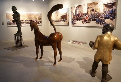 其次,展览空间的极度压缩,也导致作品之间场域互侵严重。虽然作品按照展览分主题被进行了有效的区域划分,但是,作品在材质、类型和呈现方式上的差异,不可避免地对需要展示的环境有着不同的要求,雕塑、装置、油画、图片、影像的各自呈现就差异甚大,而上述要求,由于空间的客观限制,已显得极为奢侈了。其结果是,一位艺术家的一组作品往往被另一位艺术家的异质性作品从中割断,如雕塑家戴耘的两座砖雕作品被另一位艺术家的装置成功“离间”了;或者,两位艺术家类型互异的作品被过于“亲密”地并置在一起,从而让人不由自主地产生一种极度怪异的观感,如艺术家任思鸿的雕塑《向日葵·梵高》《美女马·毕加索》就被咫尺之遥的另一位艺术家纪实风格的图片悄然围困着。