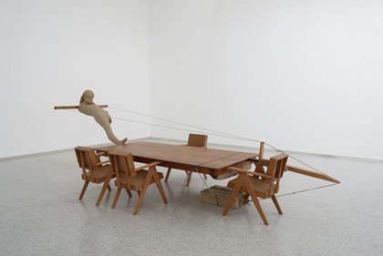 作为作品基座和桌椅所呈现的体感上的木头之硬,与树脂所模拟的泥质人体的脆弱,生命的有情与客观物体的无情, 由紧绷的钢缆所维系的、看似毫无关联的物体之间的紧张关系,或许试图告诉人们,围绕者个体展开的、带有自身内在完整性的诸多物品不过是一个复杂而脆弱的系统,借助该系统,日常平庸的和极端的表达彼此不可分割地被链接在一起。而这恐怕就是艺术家通过对人的内在心灵观察之后所得出的大致诊断报告。