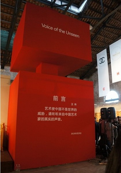 在展览开幕现场的实体LOGO上,醒目地书写着王林先生有关本次展览的微言大义——“艺术使中国不是世界的威胁,请听来自中国艺术家的真实的声音”。