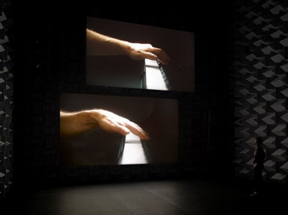 在第一个展厅,放映的《缠绕、缠绕》将两部共时短片上下并置,分别播放着两位经艺术家亲自挑选的钢琴家:洛尔迪(Louis Lortie)和巴沃塞(Jean-Efflam Bavouzet)在同时弹奏法国作曲家拉威尔(Maurice Ravel)1930年特地为奥地利独臂钢琴家维特根施泰因创作的《D大调左手钢琴协奏曲》,按照要求,两位钢琴家只能用左手弹奏,右手保持不动,整只曲子用时均为20分45秒。上述两部短片系在法国国家交响乐团录制,现场指挥为贝内梯(Didier benetti)。