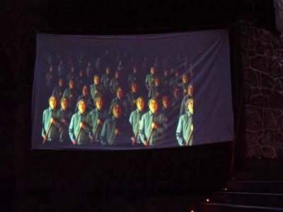 王功新的录像作品《我的太阳》把美术馆变成一个露天电影院,大家坐在花坛上看着太阳从大地上升起,一群农民围着太阳伸手捧出火苗,火苗从手中升上天空变成星星。天上的星星像是从画面里跑出去的。
