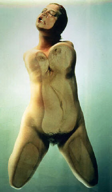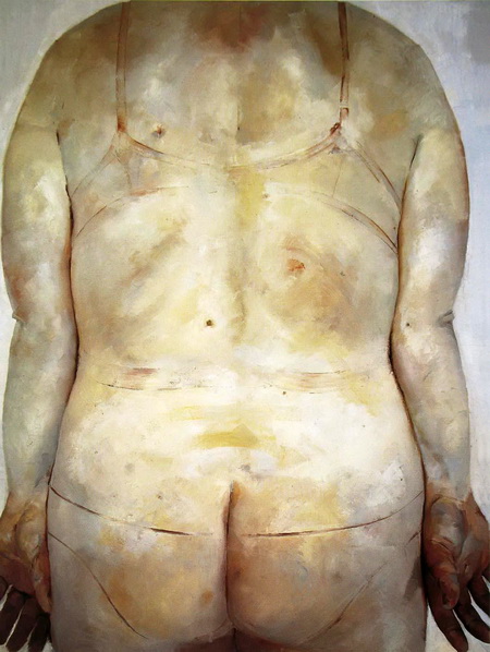 珍妮·萨维尔的作品尺幅巨大,大多以自己的身体为模特。她从女性的视觉和自己的感受入手,对自己的身体进行不同角度的审视和表现。西方传统的古典主义女性唯美化,甚至于色情化的形象,在她画中荡然无存。凸现在巨幅画布上的女人体,犹如一头大象、一块巨石、一座山丘一样高大结实,彻底击溃男性审视女性时先天所包含的色情意识和态度。女性并没有像男性想象的那么柔美、脆弱。