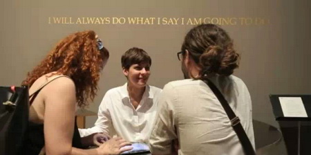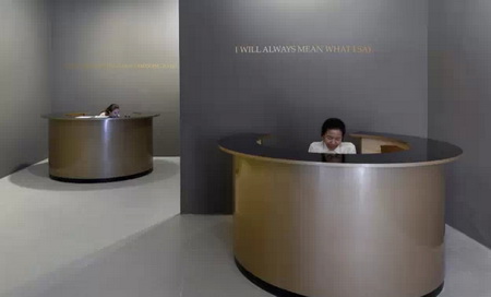 在作品“可能的信托注册台”中,画廊空间本身被转化为三个寻常公司的接待台式的环境,每一位前台接待者负责将个人声明合同赋予每个人自己选择的公众。与威尼斯双年展上的作品有三个类似的规则:“我将永远身价高昂,无法出售”;“我将永远言出本意”;“我将永远言出必行”。
