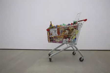 在一年多以前,何利平一次性买了约500元的食品,存储至它们过期(过期食品、超市购物车和装裱好的发票清单)