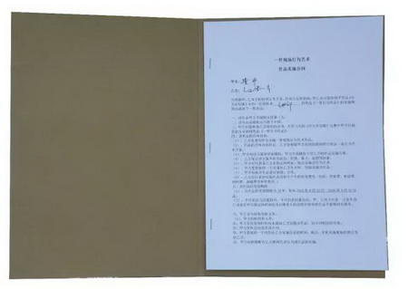 艺术家拟定了一份行为艺术实施合同,获胜者可以要求艺术家在指定的时间、地点实施一件现场行为艺术作品(具体方案艺术家将根据获胜者提供的现场图片制定方案)。艺术家自行承担全部费用。