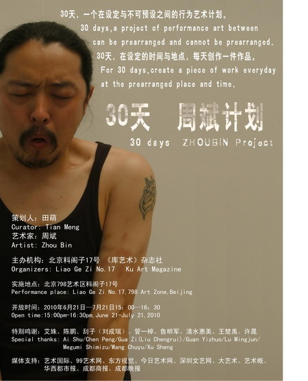从2010年6月22日开始到7月下旬结束,成都知名行为艺术家周斌在北京798艺术区尝试了一个极富挑战性的项目:“30天·周斌计划”———每天临时构想一个行为艺术来实施,其中不乏惊人之举。昨天下午,周斌在成都芳沁路的一家酒吧举行交流会,放映了自己30天行为艺术的记录影像和资料,并就现场观众提出的行为艺术问题进行了回答