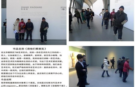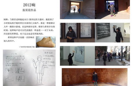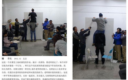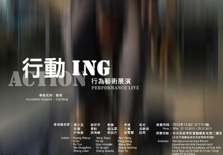 2012年12月21日,中央美术学院实验艺术研究生一年级同学在实验艺术第二讲堂举办了蔡青指导的行为艺术课程教学检查。参加教检的同学有:焦朦、普耘、彭湘、黄文亚、马克、王薇、赵雨、张海峰、张丽丹、姜昕宇、李波、吴耿祯、张霄霞、钱泓霖、叶秋森共十六位同学,分别展出了同学们在实验艺术课程中行为作品的影像和方案草图。展览持续至12月23日,为蔡青老师的行为艺术课程画上一个圆满的句号。