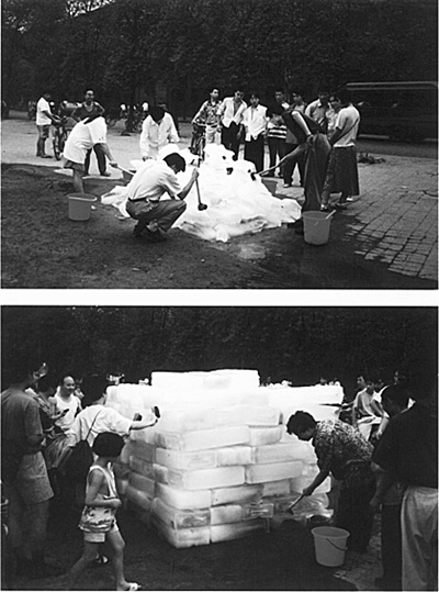 上世纪八十年代以来,振兴经济一直是国家的发展战略,虽然在短短二十年时间里,中国的经济快速增长,举世瞩目。但与此同时也出现了环境破坏的问题。比如,成都府南河水就和全国的许多河流一样,污染非常严重。为了形象地说明问题的严重性,艺术家借用现代工业手段将府南河水取出了十立方米,在冰厂制成冰块,然后再运回到岸边以清水加以洗刷。过路的行人和市民见状也纷纷参与其中,结果,洗刷的活动持续了两天,地面也因此留下了污迹斑斑。许多媒体对这一情况做了报道,社会反响极为强烈。作品清楚地表明了广大市民希望让河水变清的心理诉求。