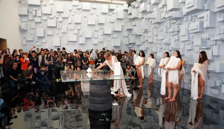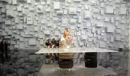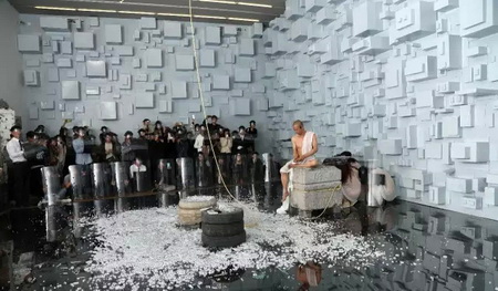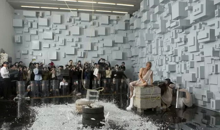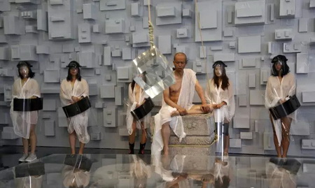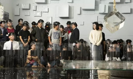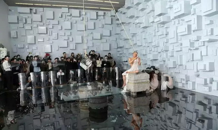 《宁静致远》一周之后,是《镜心云影》。进入现场当观众,要戴头盔,要签生死状。巨大的水晶,何云昌推了两下,晃动两个半小时,场面近乎陷入了真空。完全、绝对的静止之后,轰然一声,行为结束。