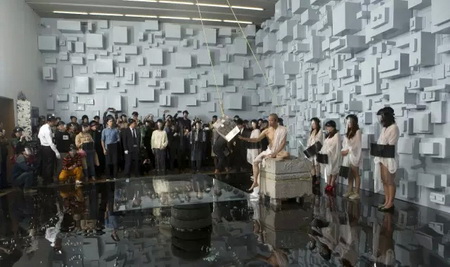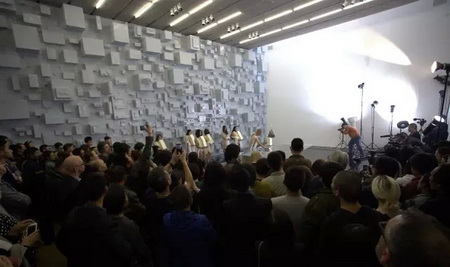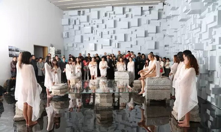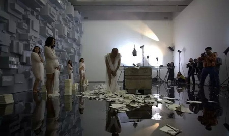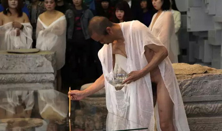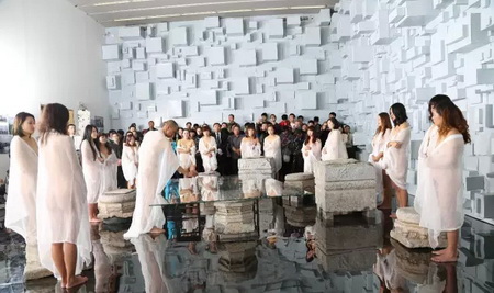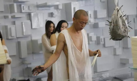10月17号下午,去墨斋看何云昌的人很多。据他自己透露,《心殿》会是一个节点,当然没有人会愿意错过这一“历史性”事件。这天呈现了行为第一场《宁静致远》,墨汁缓缓的滴落,何云昌满脸愁容的擦拭,平静的循环往复持续了整整三小时。期间,连模特也扛不住,跑掉了一个。看起来,这次他没再那么激烈地使用身体,场面有些平淡。展厅里,没人熬得过主角儿,观众们来了又走,走了又来。