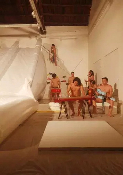 在两个24000瓦的超级探照灯的照耀下,裸男们越玩越High。张乐华将头发蘸在颜料里,旁边两个人抬着他的身子用头发画画;杨俊岭被几个人用油画布包起来钉在墙上,被各种蹂躏;后来已经被彻底砸散架子的提琴,被林科重新组装成一个雕塑,挂在了滑梯上方;几个“双飞小球”,皮球、排球、足球在全场乱飞;杨俊岭甚至拿起喂足了克莱因蓝水的呲水枪,向周围人以及观众喷射,吓得现场观众赶紧用画廊准备好的蓝色雨衣挡住身体;现场不知是谁送来了一盘美味的蛋糕,崔绍翰端着蛋糕给在场的每一个观众分享……太多的即兴、太多的始料未及,玩到后来,八位裸男已经忘记了周围的观众,忘记了自己还在表演,忘情地玩到High翻。