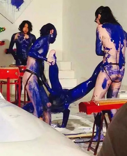 当然也有不“刻意”和网络互动,但是同样刷满屏的,这样的行为大概只有“双飞艺术中心”可以做得到。今年4月,空间站画廊里打着大型控照灯,照着七个蓝色的裸男进行各种离奇的表演,双飞艺术中心把这次个展命名为“双飞克莱因蓝”。据说这是他们为了向1960年代伊夫克莱茵的经典作品致敬——当时克莱茵用蓝色涂满裸女身体,让女人的身体滚过画布作为作品。双飞希望将这经典的一幕重现。克莱茵蓝贯穿了双飞的整场表演,每个裸男身体都沾满了这纯粹的蓝。