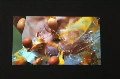 “撞蛋,赢大奖,过五一”,美术馆工作人员在今日美术馆一号馆二层的展场内招呼着前来的观众报名买鸡蛋参赛撞蛋。比赛时间为开幕当天至6日,选手在现场以一元的价格购买一枚鸡蛋,每轮两位选手登台手握鸡蛋互相撞击,蛋不破者胜;前六天为初赛,每天产生优胜奖并获得1000元奖金,6日总决赛将获得5000元奖金并现场颁发。场馆另一个展厅内放置有双飞“撞蛋”的影像作品,一面长长的白展墙画布及手边的颜料,等待着观众去“书写”。