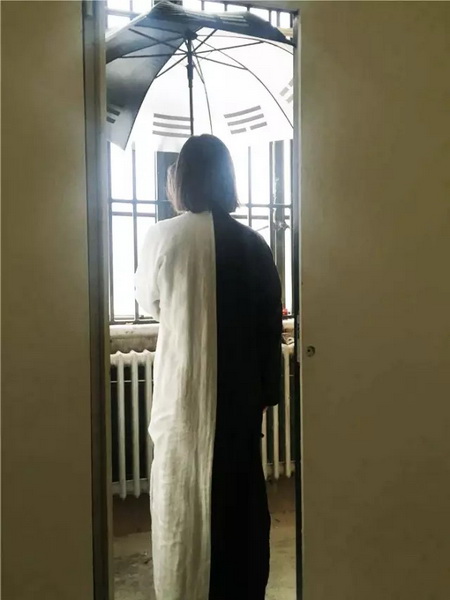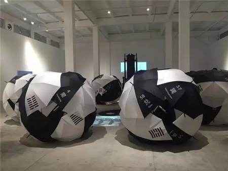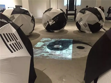 ▲黄锐 2015 香港 现场表演 易经64卦伞(64把) 一个黑白两色的阴阳图 影像 6分钟