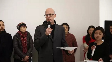 ▲展览策展人之一乔纳斯(Jonas Stampe)开幕发言