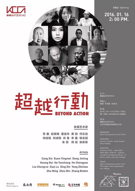 2016年1月16日,由茜茜、乔纳斯、陈赟冰共同策划的行为艺术展览《“Beyond Action”超越行动》在麒麟当代艺术空间开幕。本次行为艺术展集合了中国艺术界13位行为艺术先锋:朱冥、肖鲁、黄锐、段英梅、苍鑫、周斌、何云昌、幸鑫、杨志超、何成瑶、董金玲、刘成瑞、张彬彬,共同为观众呈现一场中国行为艺术的盛宴。在这个“超越行动”的概念下,展览希望观众能够对中国当代行为艺术的状况,有更全面的历史观及更精深的理解,展览将持续至4月6日。