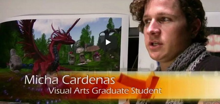 美国表演和新媒体艺术家MichaCárdenas的作品探讨了生物技术,可穿戴计算以及真实世界和虚拟世界的交叉点的影响。她的工作调查了技术可以扩展和改变人体的方式,特别是超越传统的性别角色。早在2008年,Cárdenas就在“第二人生”中表演了“成为龙”,这是一部365小时的混合现实表演。在整个365个小时里,卡德纳斯采取了一条名为阿兹德尔斯莱德的龙的形式。