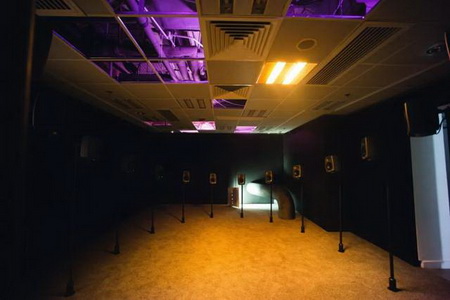而对“虚构”的一场大型实验,则是表现在另一件新作《合成音乐#1.5(feat.NESS研究小组与Stephan Moore)》(2019)之中。这是杨嘉辉与爱丁堡大学NESS(Next Generation Sound Synthesis)研究小组合作创作的作品,杨嘉辉借NESS的实体塑模技术,以演算法模拟音源的物理特性,复制某一部分的声音,由此在软件中设计出虚拟乐器并使其发声和奏乐。当然,这仅仅是类似于思想实验的第一步。作曲家往往对于空间和时间具有一种超越常人的感知力,杨嘉辉正是充分发挥了这一本能的优势,在多维空间里垒起了一整套介于现实与非现实之间流动的演奏系统:横穿展厅的庞大黑色管道、斜切进墙面的巨型漏斗、无声影像中飞翔的火龙和占据一整个运动场的长号,以及那些看上去或欢呼或落泪的人群;藏在暗处的拼接的人体雕塑;那张半掩着的“Oh! What a Lovely War”的海报……各种元素以微妙的互动和牵连维系平衡,并建构了迷宫的前半部分,而随着观者的介入、行走、思考,和向下一空间的移动,线索逐渐累积串联。下一个空间里围成一圈的高低起落的音响,按精准的时间表启动奏响一系列参考了军号声的乐曲(这些乐曲正是由软件模拟出来的虚拟乐器所演奏出来);空间顶部随声音频率闪烁的彩色灯光,将所谓“音色”以可视的形态呈现出来;乐曲响起,众声喧哗戛然而止,观者也恍然大悟:现实空间里显现出一个镶嵌在整个艺术中心墙体里的巨大管乐器,它正是在软件中被虚构的乐器,它可以用300度的气息吹奏,吹奏它的是人类传说和想象中的火龙,所以它也必然是20尺的庞然巨物,当这种乐器发声,震耳欲聋,人间的喜怒哀乐皆听它发号施令……杨嘉辉以一种结合传统和创新的方式,打破对空间和时间的固有认知,让观者在空间中行走之时,借各种零散的信息拼图,反复推敲和想象着这种“乐器”背后所可能具有的历史叙事,亦或政治意味,进而反思声音/音乐和人类文明、社会演进之间的相互关系。更进一步说,杨嘉辉对乐器、对乐器的塑造和发声过程的想象和虚构,也恰恰隐喻着社会、历史、文明和人类精神世界的形塑过程。