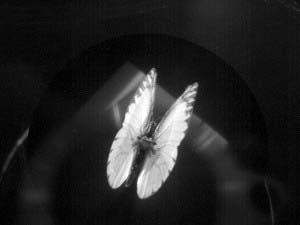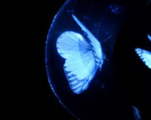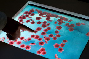 在《化境》作品中,林俊廷藉由触控面板引出春(梅)、夏(兰)、秋(竹)、冬(菊),观者可以透过推、拖、拉、点的方式,慢慢看到这四种植物在荧光屏缓缓长成,时间在这件作品则以蝴蝶这个象征物出现,低飞、轻舞;四季在观者手中幻化自如。基本上,这件作品的气质十分古典,林俊廷固然是采取3D作为表达方式,但他却让画面能够呈现出2D平面视觉效果,传统中国水墨画的情境与墨韵清逸,很鲜活、自然地展现于面前。计算机科技的冰冷,倒是在这件作品身上,有了文化的温度发散出来。至于《蝶域》这件作品,再度延用了蝴蝶这个隐喻,观者进入空间,一记光束从天洒下,地板点点幻幻,细看才知是蝴蝶,抬头;只见漫天增多了彩蝶,似乎随着观者的移动在追逐着。观者接着会看到角落有一个黑色方体,一接近玻璃镜面才知道上头停栖着一只蝴蝶,当你的手一接近可望抓着牠;蝴蝶,飞了!你的手一离开,嘿;牠又歇息在那儿!然后,你会看到墙上出现了一个金色画框,中央好像摆放着一张纸片,依稀写着【庄周梦蝶】字样,真接近想要看个仔细,纸片消失、中央换成一朵金色玫瑰花。旋即,几只彷佛透明精灵般蝴蝶绕着玫瑰花转了之后;跃飞而起。鼓翅之间,天空洒落好多金粉,观者就在这不经意的过程里面,沾上了金粉,走出了展场,一切就好像在无意中捡拾起某个片断,有点不真实;却又好像很实在经历过一场惊艳,好比肩上、身上的金粉,很真,但也显得有些虚幻。【庄周梦蝶】,是个很旧的中国文本,但他让旧的文本;转换成一种人对某种理想的怀想,蝴蝶;成为一种人对于太惯性的事物或人,反而易起轻蔑之心的象征。就好像本来就停栖在玻璃板上的蝴蝶、金框中的金色玫瑰,它们原本就在人的生活四周,可是我们却往往会可望去抓住那不确实的纸片、如蝴蝶簇拥追逐般的虚名。等到累了、倦了,才知道所谓的幸福,原来就是曾经。