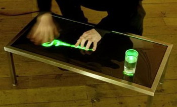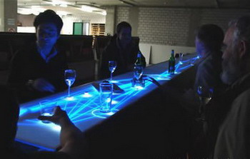 这个iBar的视频在youtube上火了已经有一段时间了,iBar是一个交互式的吧台,台子里面的视频投影仪可以在乳白色的台面上投射出各种图案,而里面的智能跟踪系统能够察觉出碰到台面的物体,这个输入信号就可以让投影仪和接触物体进行动态交互,物体被照亮,台面上不同点之间出现的光线路径等等。