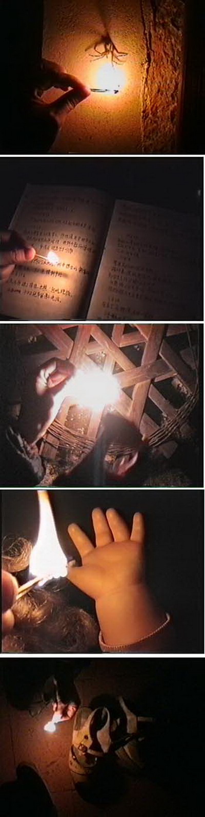 黑暗屋子中的四个不同方位的录像投影。录像中是手在不断地划火柴照亮各种物品,每次划亮火柴之间的黑暗时间不等。四盘录像带分别摄自作者居住过的四个房间。
