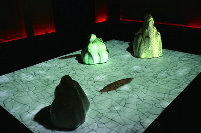 白色的石头上,投影的题材形塑平、深、高远的对比关系,空间感的错置与转换,透露了时间的无常,直让等待的石头变成山,孤独的山变成岛。光阴流徙,天鸟鱼水,时空与自然的意象倒影于此,大小深刻只是心境。