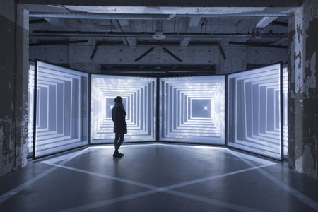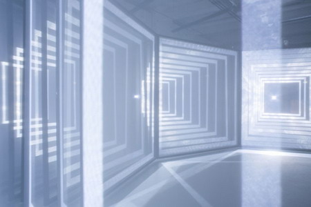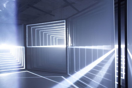 投影光线打在构成“白日梦”的一排排半透明材料上散射开来,呈现出放射性的几何形状,把参观者淹没在了另类、感官到错的蓝色空间之中。项目目前的版本由四块并排屏幕构成(前三个版本分别由一、二、三块屏幕构成),就像四个光的隧道。